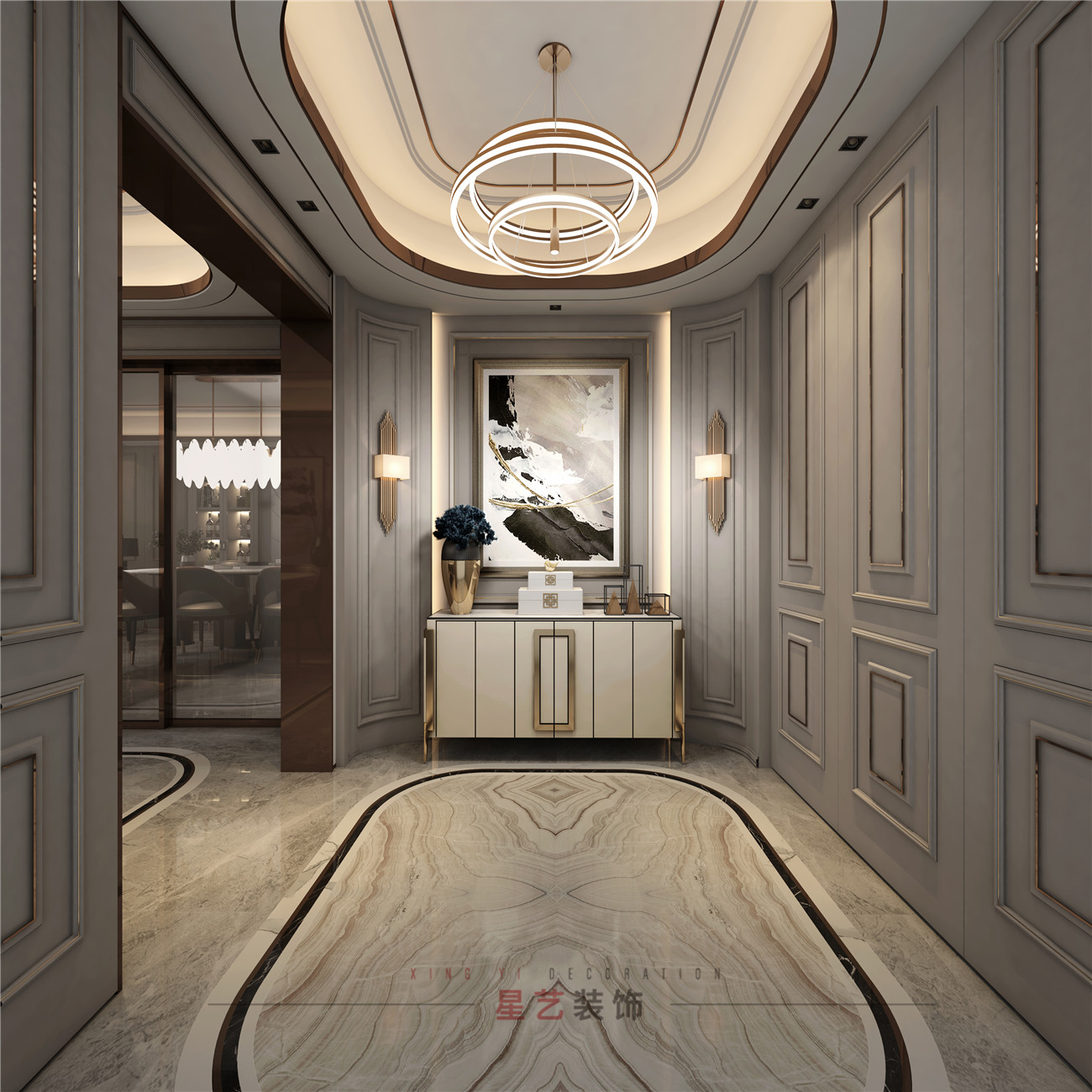 效果圖中玄關主要采用了對稱的地板花紋,和比較中規中矩的幾何圖形放大了空間的視角,整體來說會比較刻板一些。