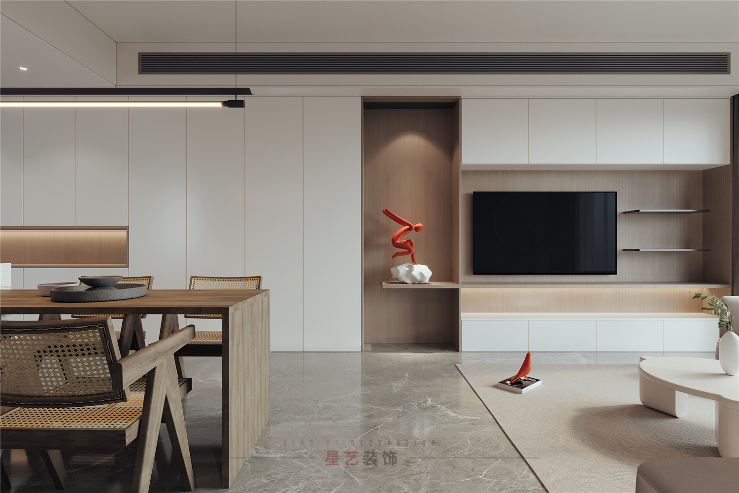 從客廳的角度可以看到極具設(shè)計感得端景,用對稱的手法把背景墻一分為二,關(guān)燈的時候可能只覺得比較特別,但開燈后,橘紅色的小人在昏暗燈光的映襯下卻營造出了藝術(shù)感和視覺美感。