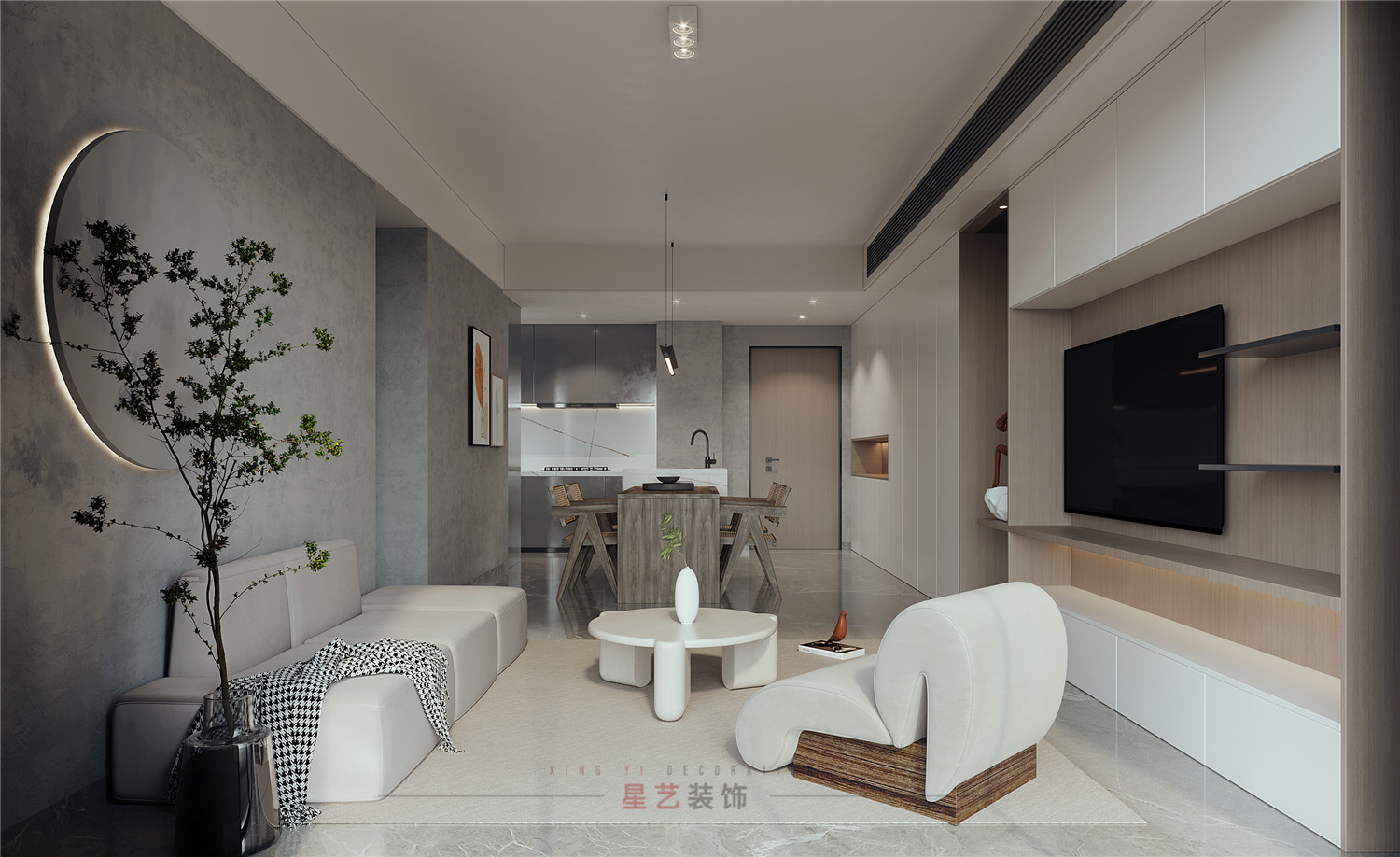 休息區(qū)主要用黑白灰的搭配設(shè)計出舒適又靜謐的空間,尤其灰色墻面凸出的圓形木藝設(shè)計,搭配燈帶像是一輪明月,在綠植的稍稍遮擋下形成了絕美的畫卷,猶如身處閑庭雅居,與最愛的人一起看花開花落。